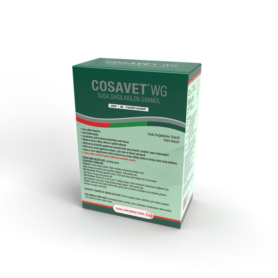 Cosavet® WG, nano ve mikron teknolojisiyle formüle edilmiş, suda dağılabilen, tozsuz, akıcı, bir mikronize kükürttür.Her bir Cosavet®WG granülü, anında etki için hızla buharlaşan 2.5 mikron ortalama parçacık boyutuna sahip binlerce kaplanmış kükürt partikülünden oluşur.